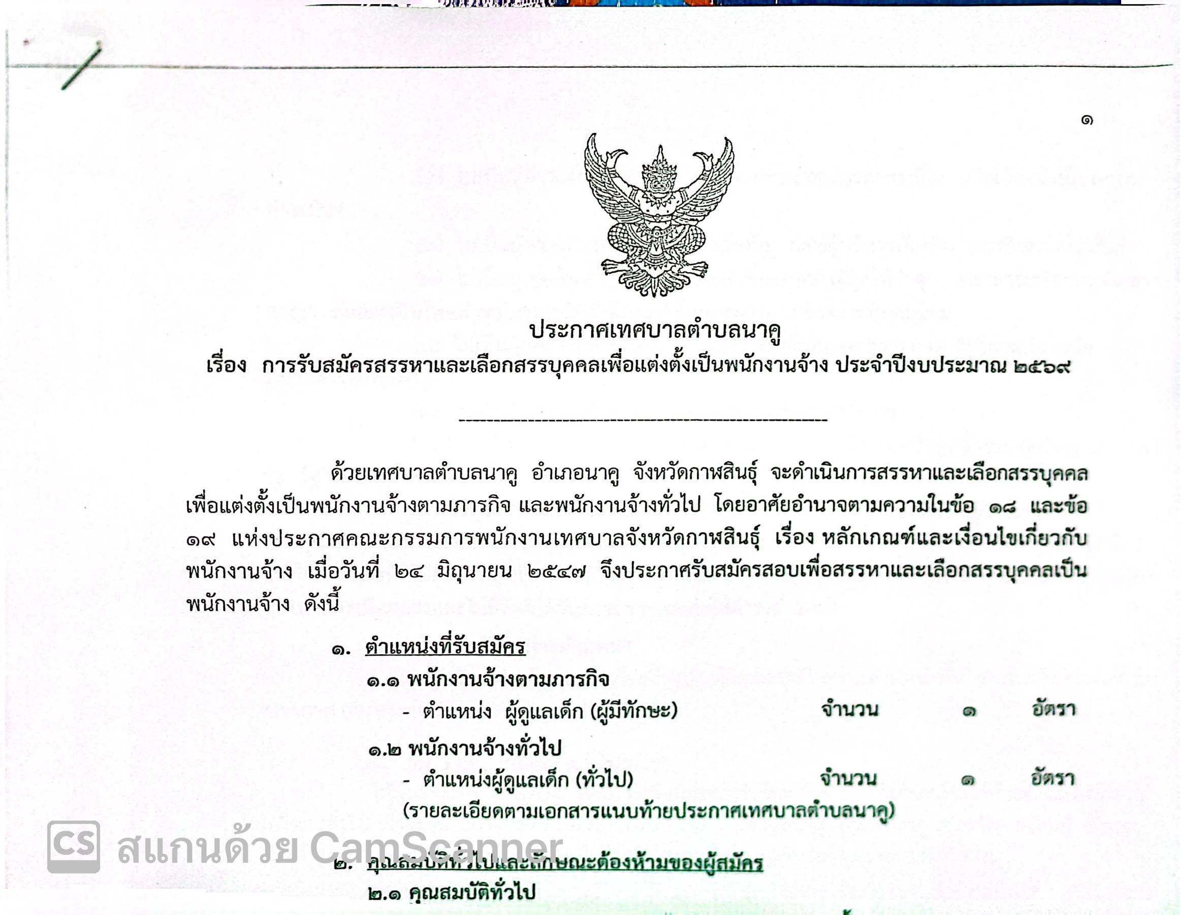 ประกาศเทศบาลตำบลนาคู เรื่อง การรับสมัครสรรหาและเลือกสรรบุคคลเพื่อแต่งตั้งเป็นพนักงานจ้าง ประจำปีงบประมาณ พ.ศ. ๒๕๖๙
