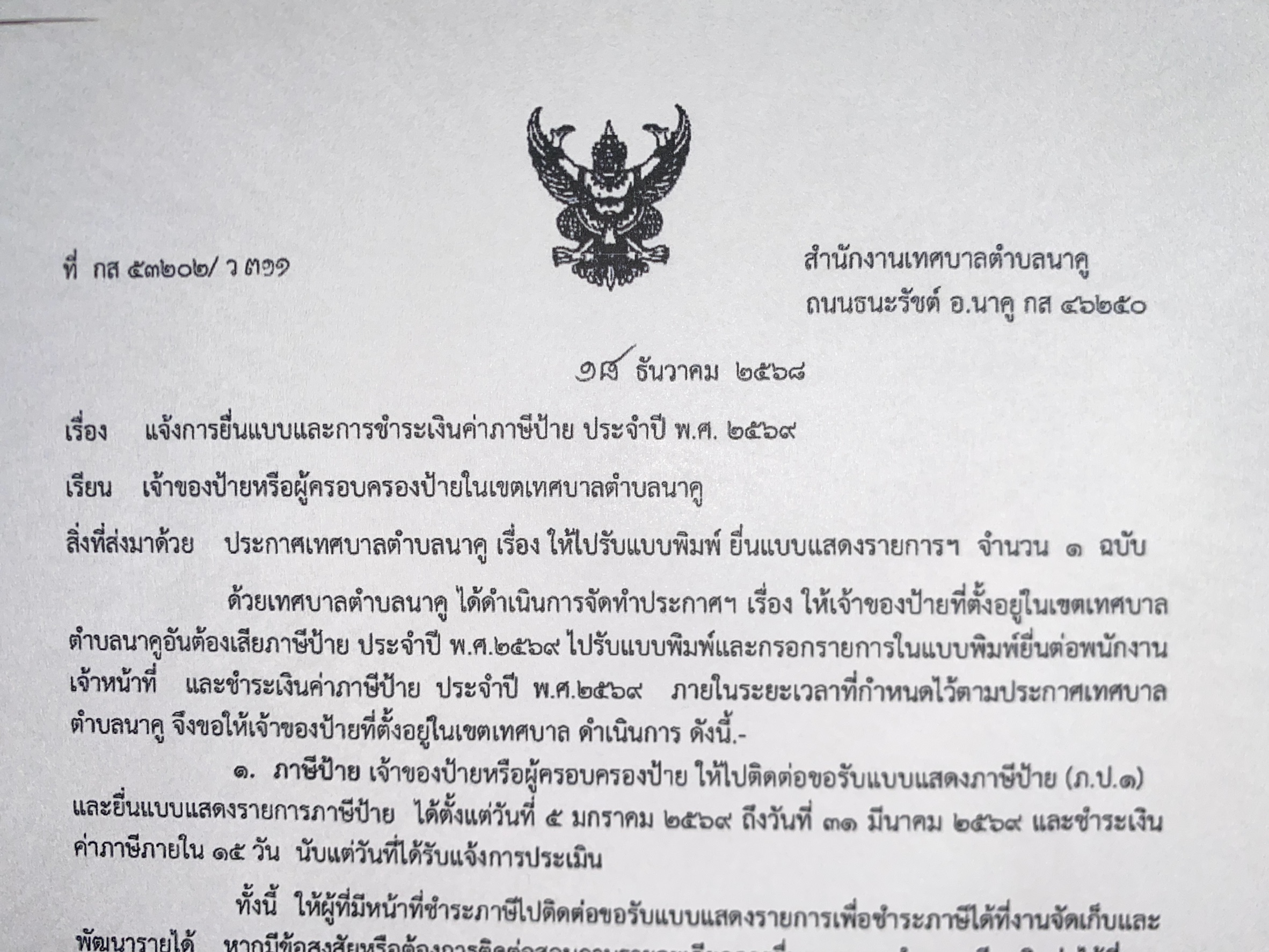 ประกาศเทศบาลตำบลนาคู เรื่อง ให้เจ้าของป้ายที่ตั้งอยู่ในเขตเทศบาลตำบลนาคู อันต้องเสียภาษีป้าย ประจำปี ๒๕๖๙ ไปรับแบบพิมพ์ และกรอกรายการในแบบพิมพ์ยื่นต่อพนักงานเจ้าหน้าที่
