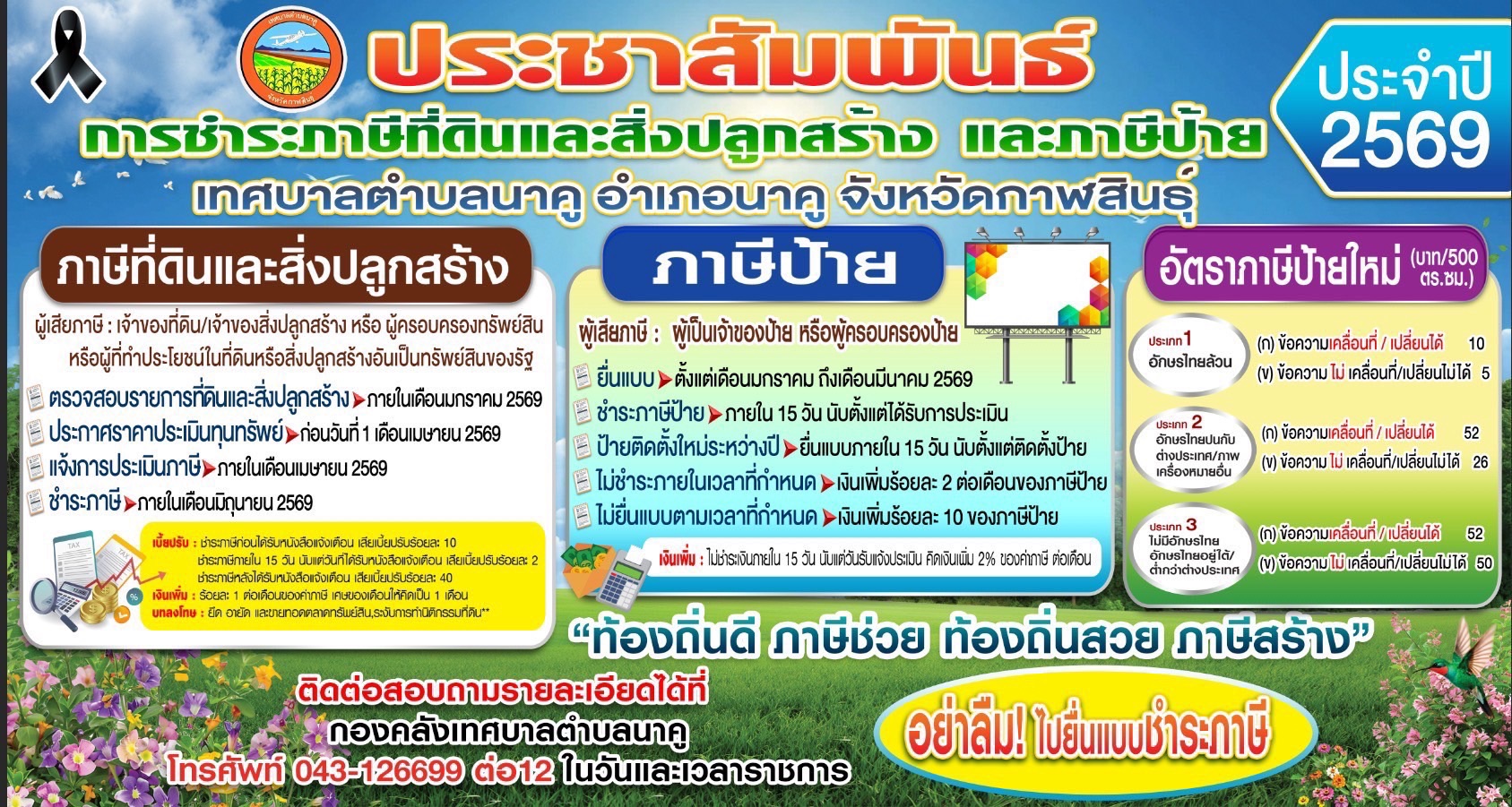 - ประกาศเทศบาลตำบลนาคู เรื่อง ให้เจ้าของป้ายที่ตั้งอยู่ในเขตเทศบาลตำบลนาคู อันต้องเสียภาษีป้าย ประจำปี ๒๕๖๙ ไปรับแบบพิมพ์ และกรอกรายการในแบบพิมพ์ยื่นต่อพนักงานเจ้าหน้าที่ , 27 มกราคม 2569