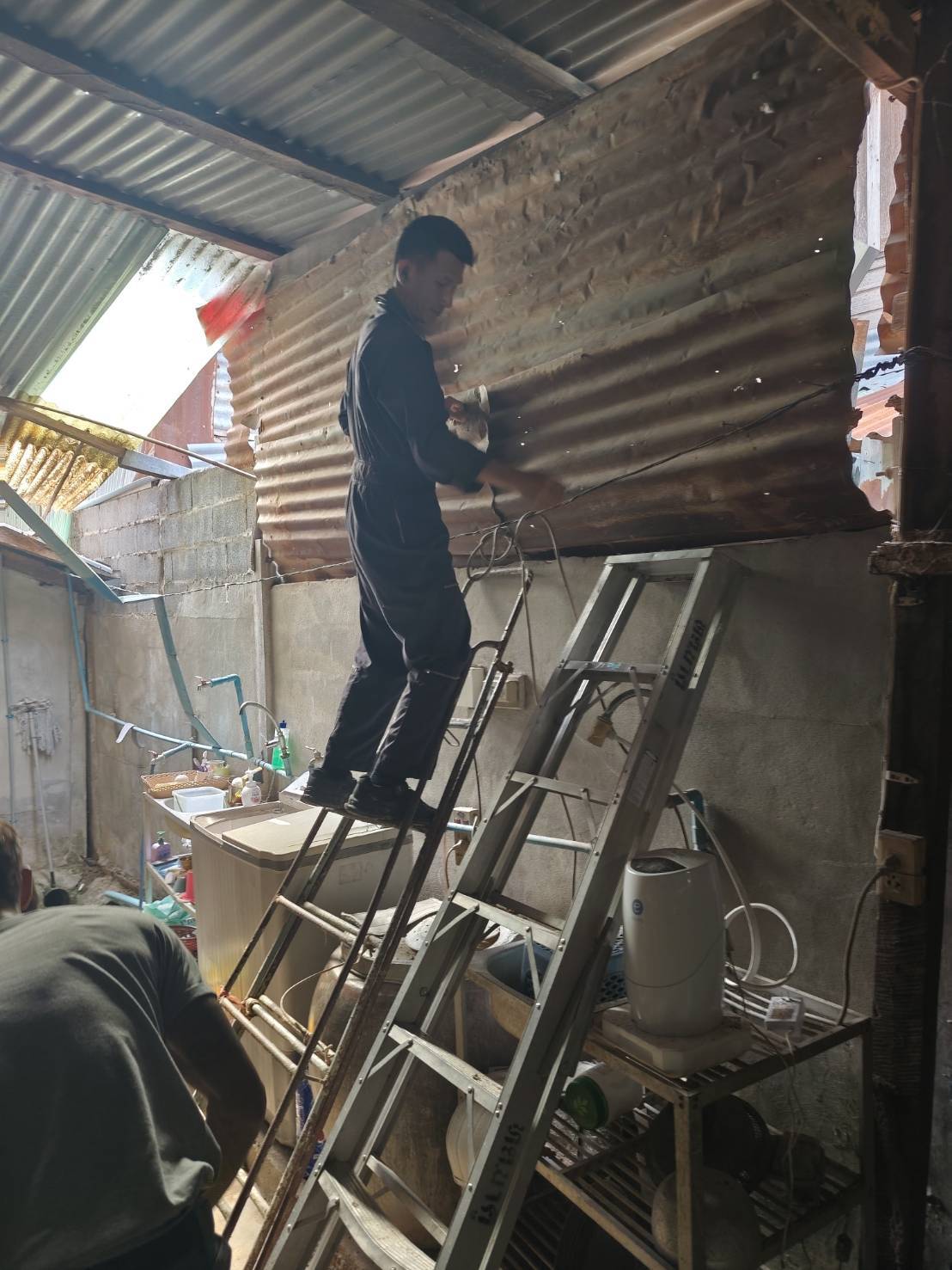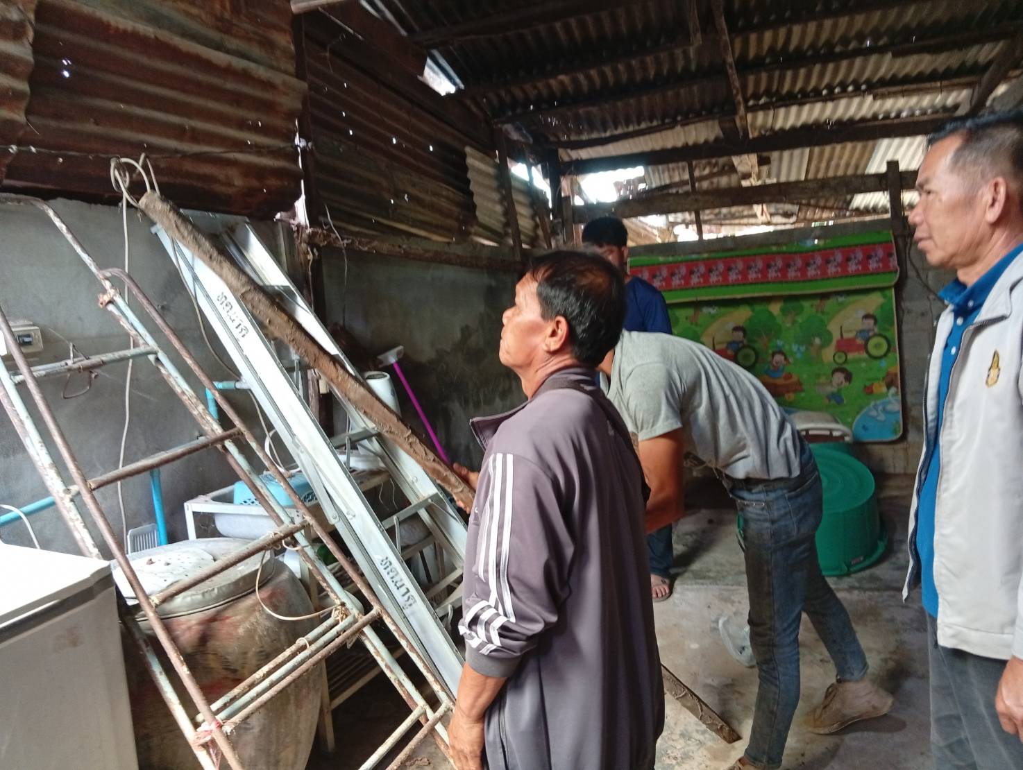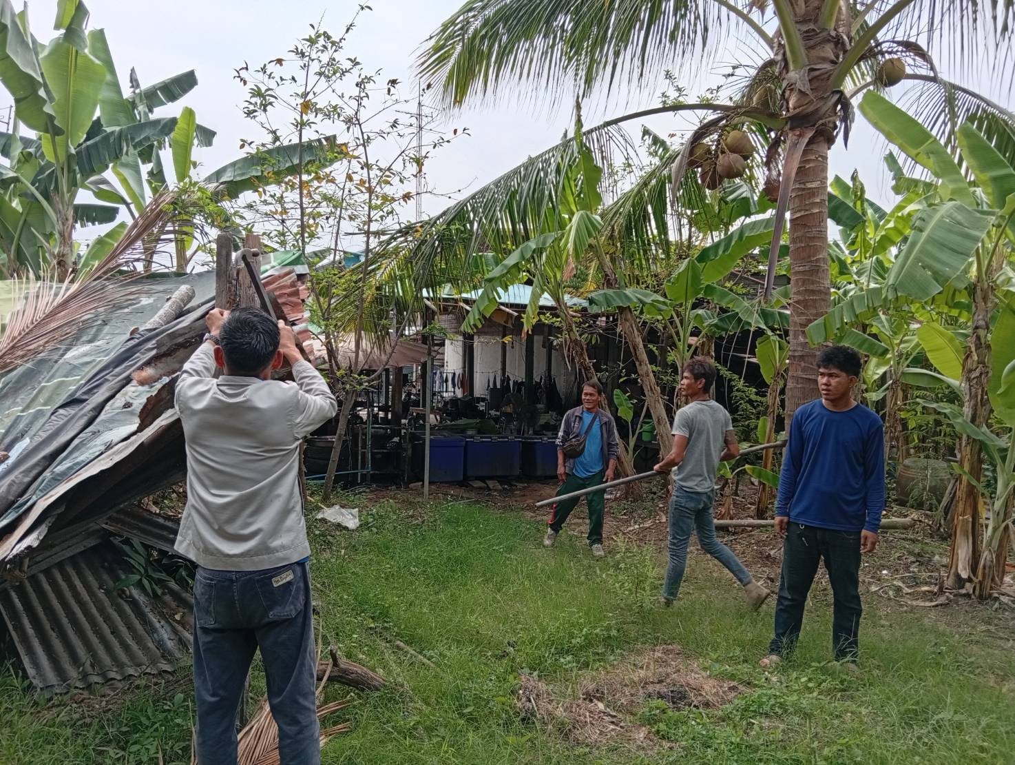เจ้าหน้าที่งานป้องกันบรรเทาสาธารณและเจ้าที่กองช่าง ออกซ่อมแซมบ้าน หมู่ 12 ตำบลนาคู อำเภอนาคู จากเหตุการณ์พายุถล่ม